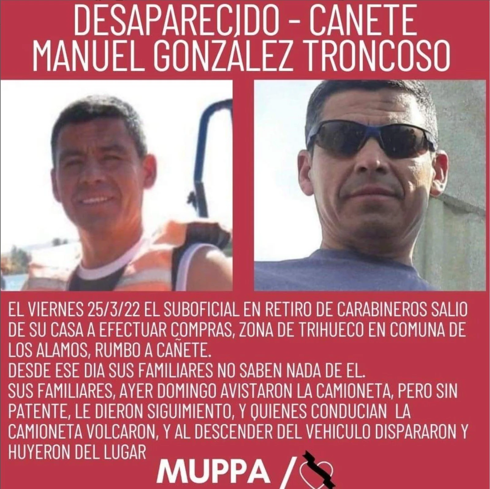 El ex suboficial salió ese día de su casa en zona Trihueco, comuna de Los Álamos con rumbo a Cañete a realizar compras, momento desde el cual no se tuvieron más noticias sobre su paradero.