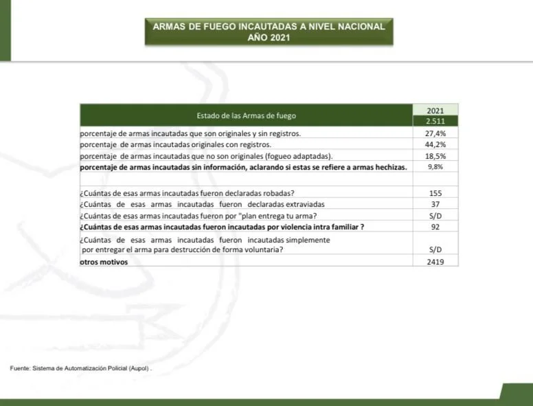 El pasado 19 de mayo, la Ministra de Interior Izkia Siches, anunció sobre el plan del gobierno para impulsar una ley de desarme total de la población y señaló en cadena nacional que, “en nuestro país tenemos más de 765.000 armas inscritas, y sabemos que en muchas de las incautaciones, más del 80% de los casos son armas legalmente inscritas, y eso requiere algunas acciones para poder fiscalizar”.