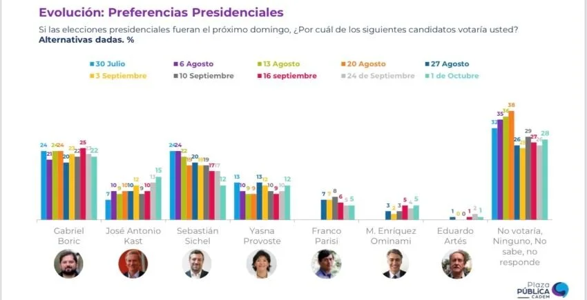 La de Cadem pone a Gabriel Boric con 22%, en segundo lugar aparece ahora José Antonio Kast (15%) y 8pts más en comparación al 30 de julio) desplazando a Sebastián Sichel, que con este 12% completa un retroceso de 12pts desde el 30 de julio y queda empatado con Yasna Provoste (12% +2pts). Más atrás les siguen Franco Parisi (5%), Marco Enríquez (5%) y Eduardo Artés (1%). El 28% no sabe, no responde o no votaría.