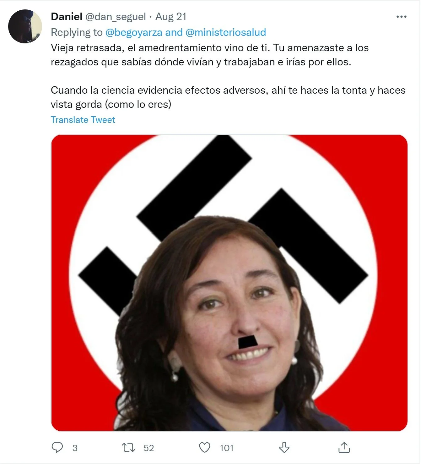 Sin embargo, la más agresiva fue la feminista radical que ocupa el Ministerio de la Mujer, Antonia Orellana, quien de manera totalitaria tuiteó: “Ningún amedrentamiento matón a la ministra va a desmentir lo que es un hecho: las vacunas funcionan y salvan vidas, las medidas de cuidado también. Todos y todas a vacunarse!”. Por su parte, el ministro Giorgio Jackson confirmó que Yarza cuenta con todo el apoyo del gobierno para seguir en la misma senda.