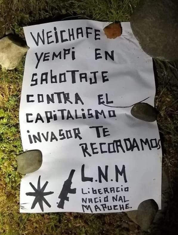 6 de noviembre de 2021: dejan panfleto adjudicándose la quema de maquinaria forestal de un particular en La Unión, región de Los Ríos. En estos, también hacen alusión al guerrillero que fue parte del ataque a miembros de las FF.AA y que resultó fallecido producto del mismo.