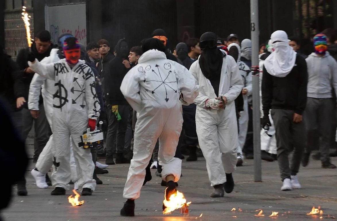 Patético: Anarquista del Instituto Nacional es quemado con bomba molotov por uno de los suyos en combate contra Carabineros