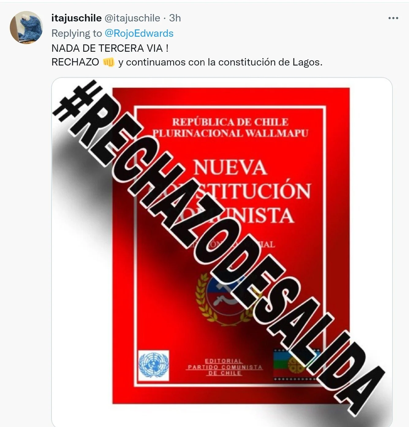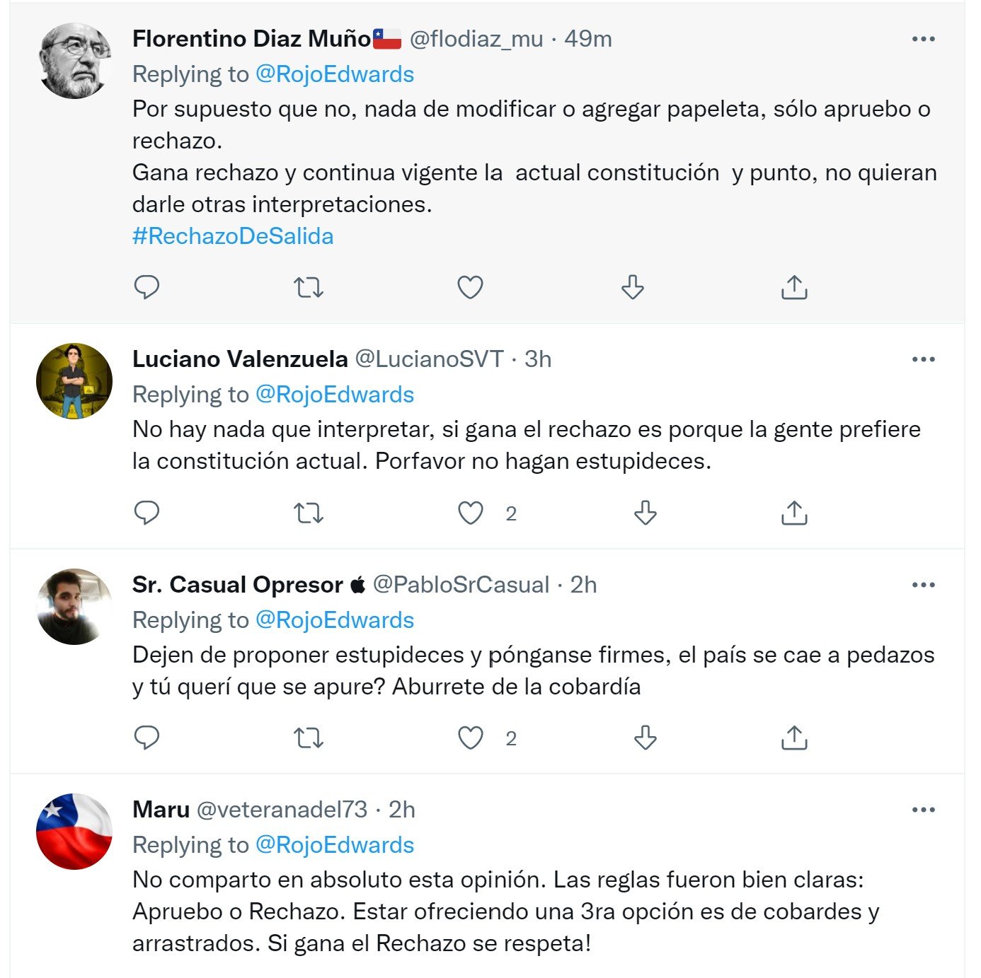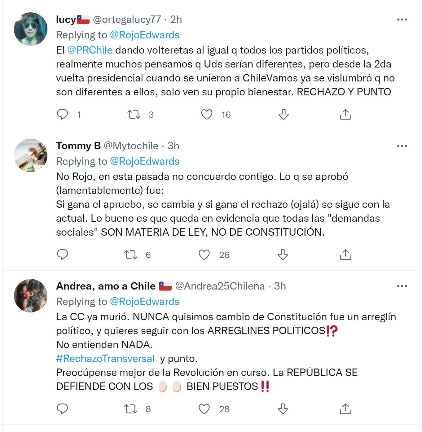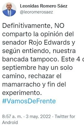 Para peor, dos diputados de su coalición rechazaron públicamente la propuesta de Edwards, Leonidas Romero twitteó: “Definitivamente, NO comparto la opinión del senador Rojo Edwards y según entiendo, nuestra bancada tampoco. Este 4 de septiembre hay un solo camino, rechazar el mamarracho y fin del experimento. #VamosDeFrente”