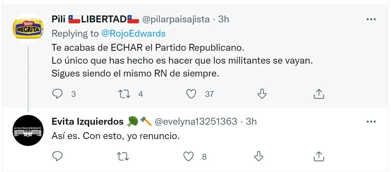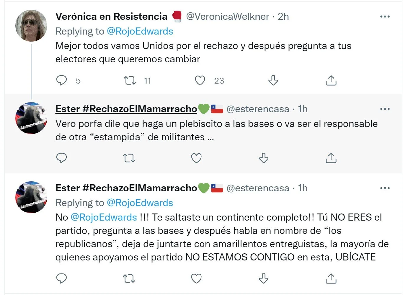 Sin embargo, la crisis se extendió a las bases, ya que numerosos militantes increparon directamente a Edwards por arrogarse la voz de todo el partido, dejamos aquí algunos twits importantes de esos militantes: