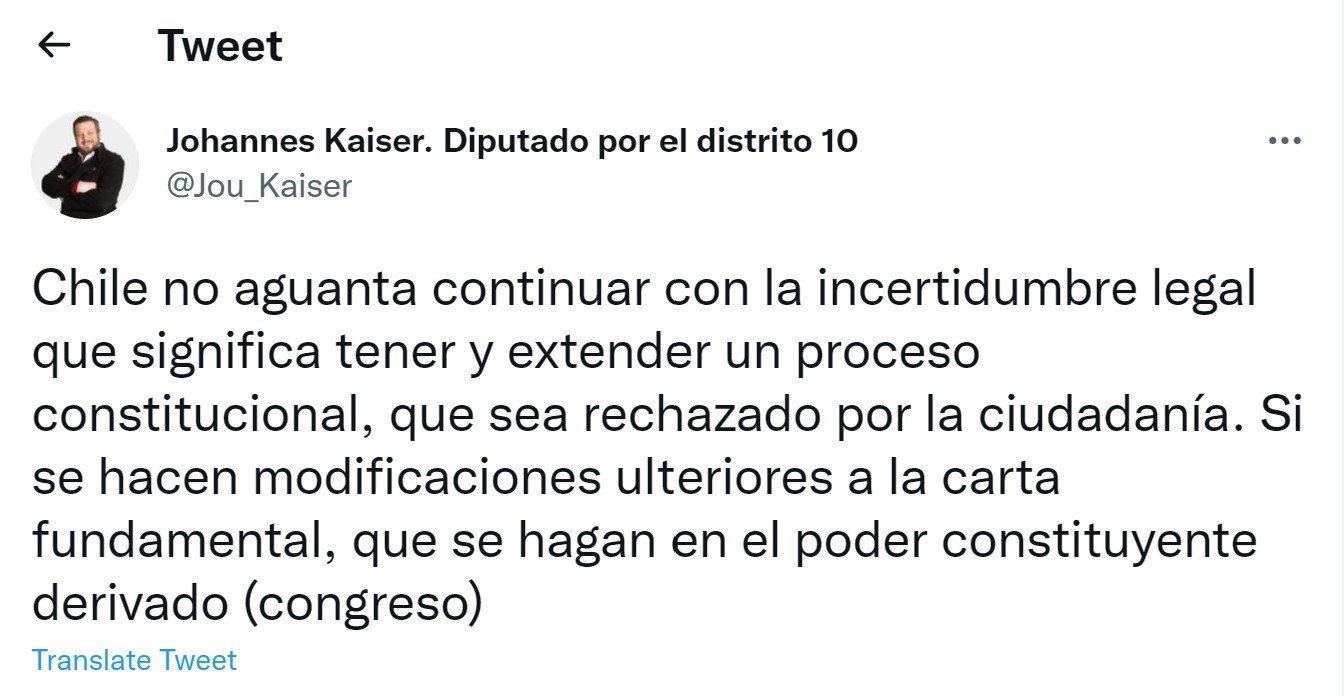 Por su parte, Johannes Kaiser indicó, también vía Twitter: “Chile no aguanta continuar con la incertidumbre legal que significa tener y extender un proceso constitucional, que sea rechazado por la ciudadanía. Si se hacen modificaciones ulteriores a la carta fundamental, que se hagan en el poder constituyente derivado (congreso)”.